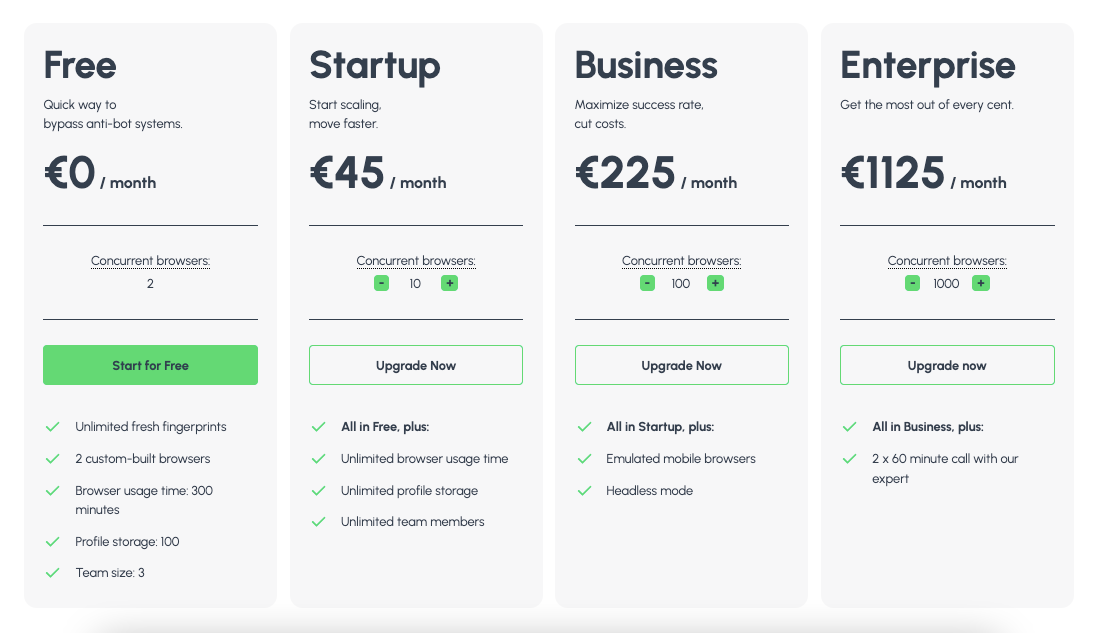 | Startup | €59 | €45 | 10 Concurrent Browsers, Unlimited Usage, Unlimited Profiles, Unlimited Team Members |