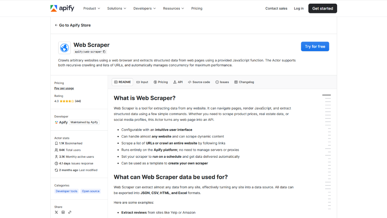 | Apify | A full platform with 1,600+ pre-built scrapers (“Actors”). | Yes | Free plan available. | Developers and non-coders who want a flexible platform with pre-built tools. |