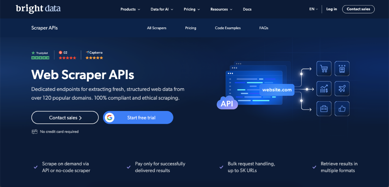 Bright Data is one of the biggest names in the data collection industry, known for its massive and high-quality proxy network. It offers a comprehensive Web Scraper API that handles all common blocking issues.