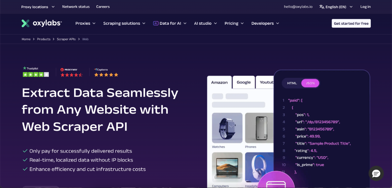 Oxylabs is another top-tier provider that focuses heavily on premium, high-performance solutions. Their Web Scraper API is powered by AI and machine learning, which helps it adapt to new anti-scraping measures.
