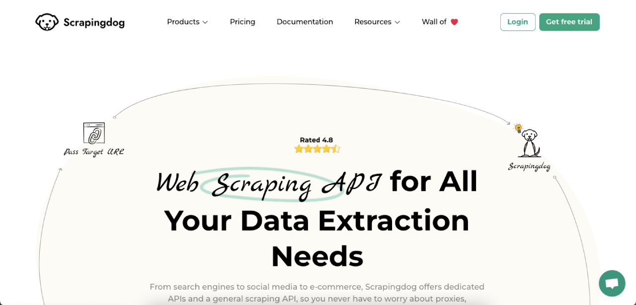 It reliably handles proxy rotation, JS rendering, and CAPTCHAs. One of its popular features is a Chrome extension that can help you generate the correct API call directly from your browser. It’s a solid, reliable tool for standard scraping tasks like price monitoring and data gathering.